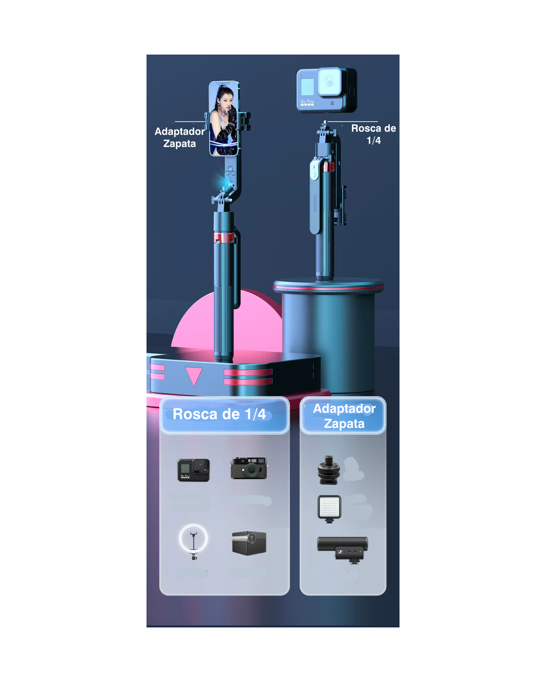Función 3 en 1 – Úsalo como selfie stick, trípode o con el control remoto Bluetooth para tomas a distancia.