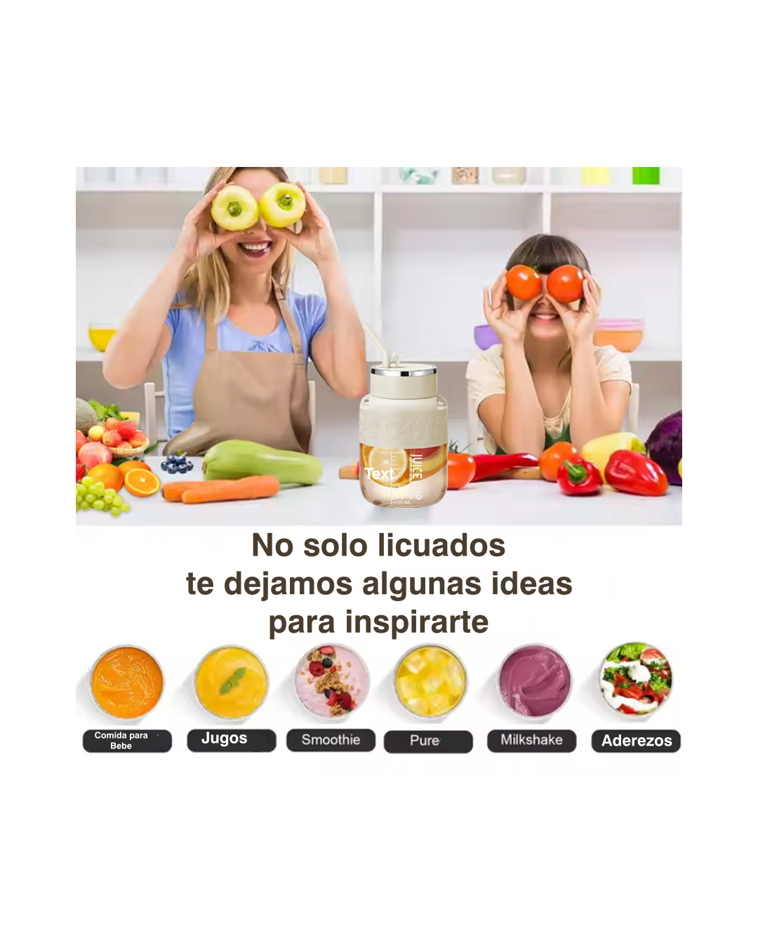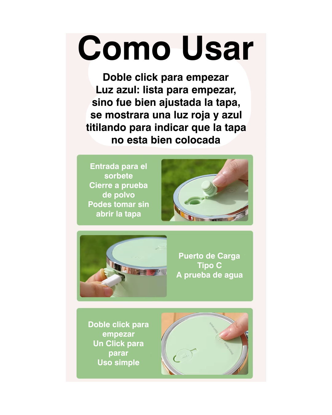 Función de juguera portátil con motor recargable por USB: mezclá y tomá desde el mismo vaso.