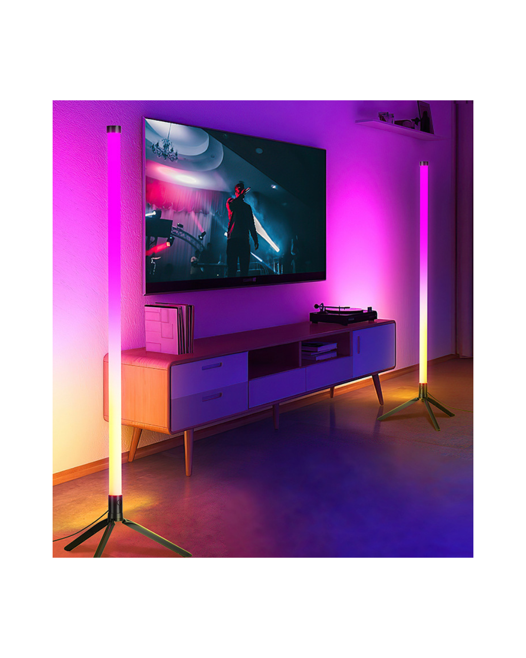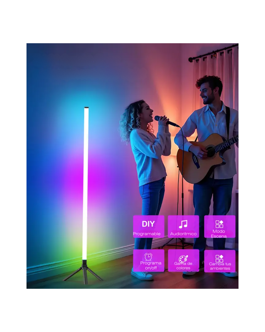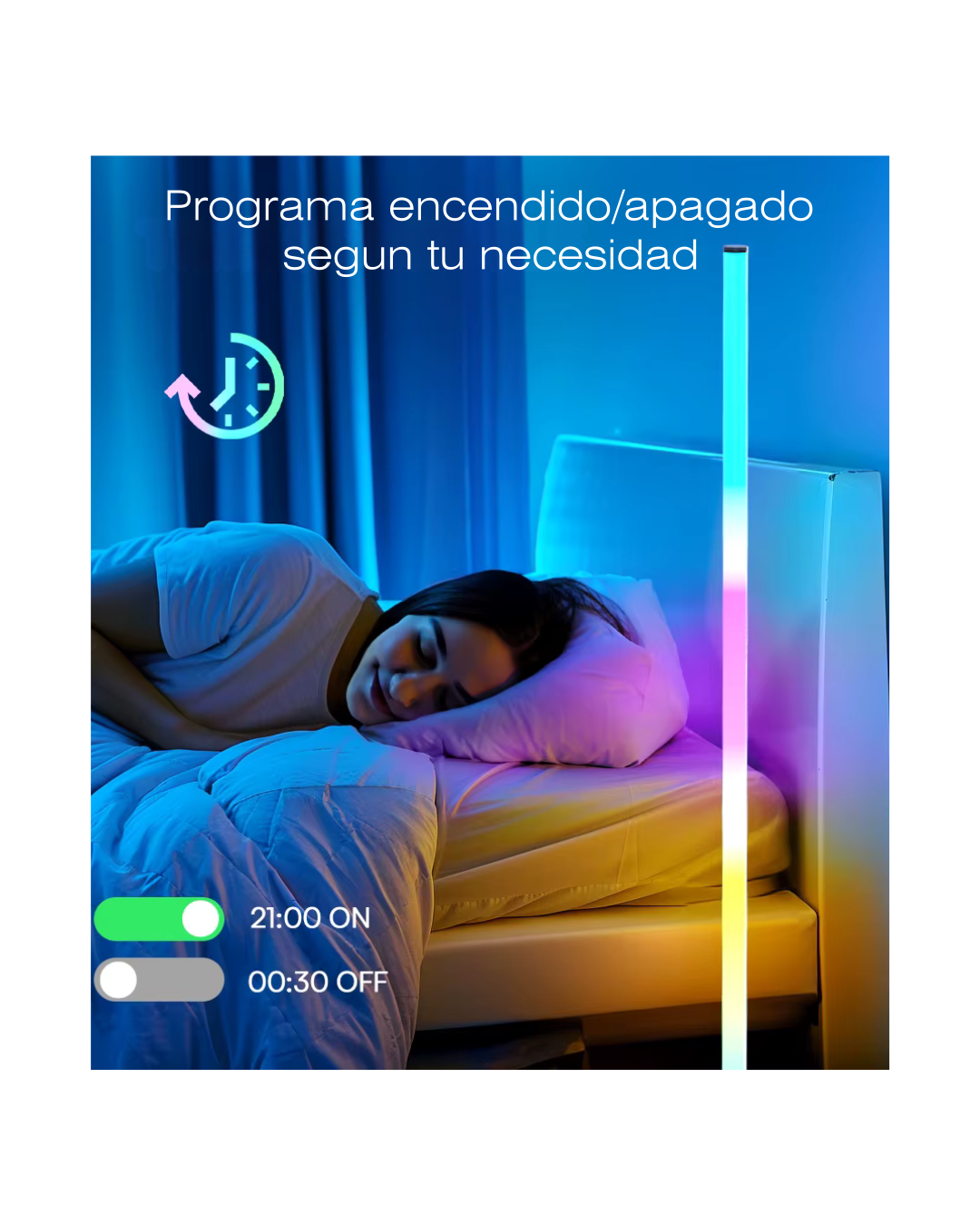 Iluminá tu espacio con estilo minimalista. La lámpara de pie esquinera LED RGB de 110 cm crea una ambientación envolvente para living, dormitorio, setup gamer o estudio, ocupando muy poco espacio en la esquina.