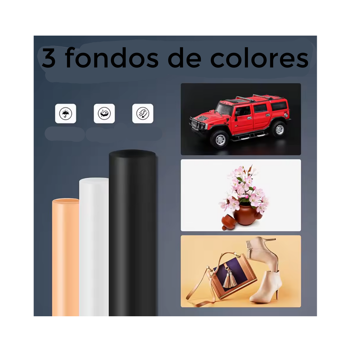 Fondos Infinitos: Incluye 3 fondos intercambiables (generalmente negro, blanco, naranja) para adaptarse a cualquier producto.