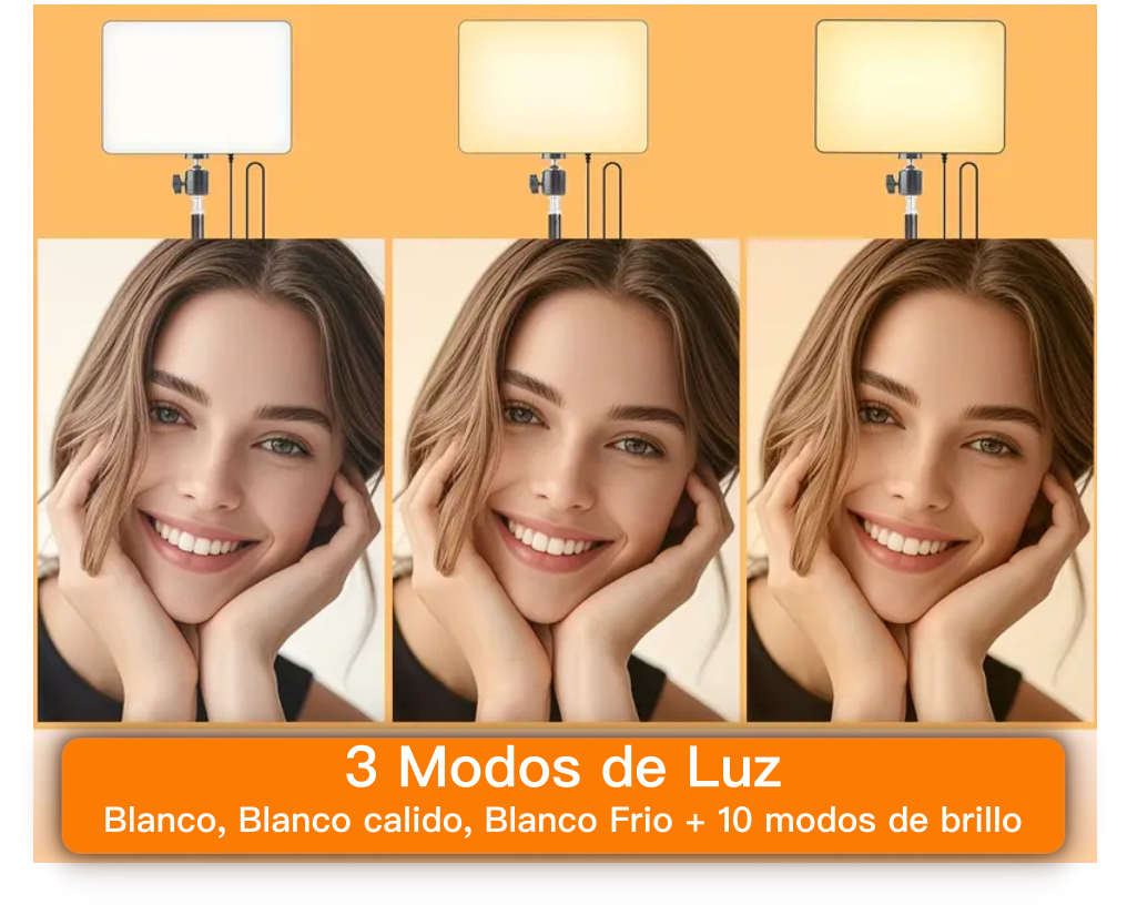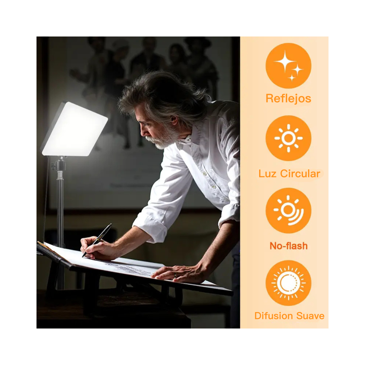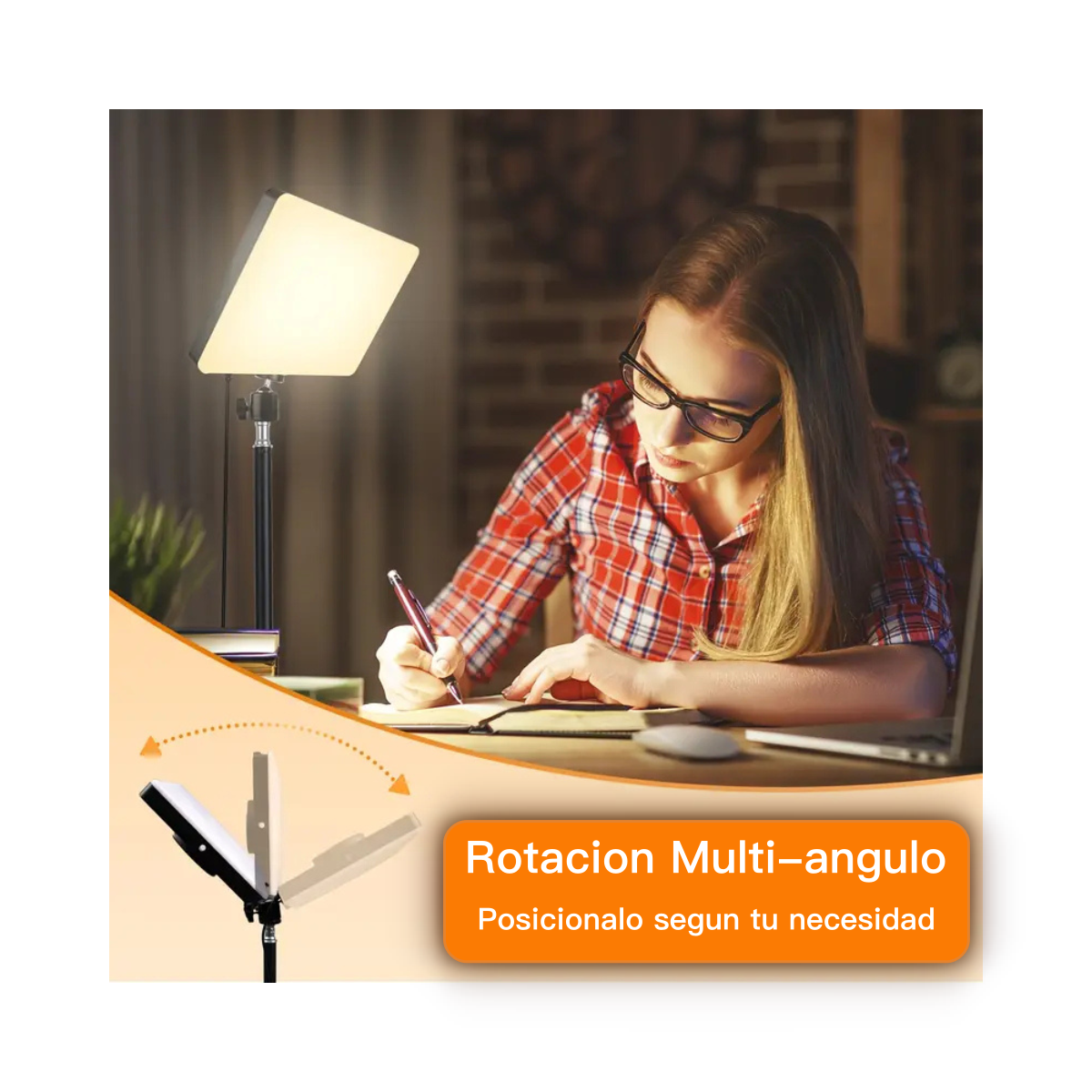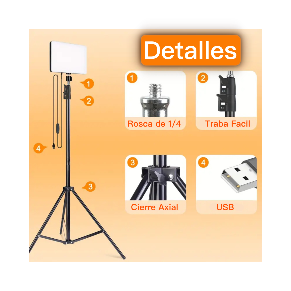 Panel LED de 10" para video y fotografĂa. Luz continua suave, regulable por USB, ideal para videollamadas, contenidos, streaming y foto de producto. TrĂpode no incluido.