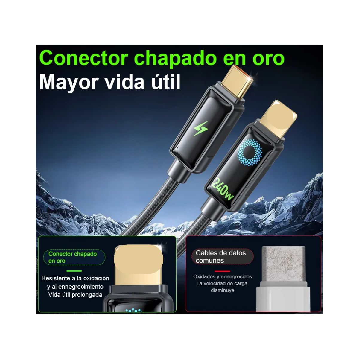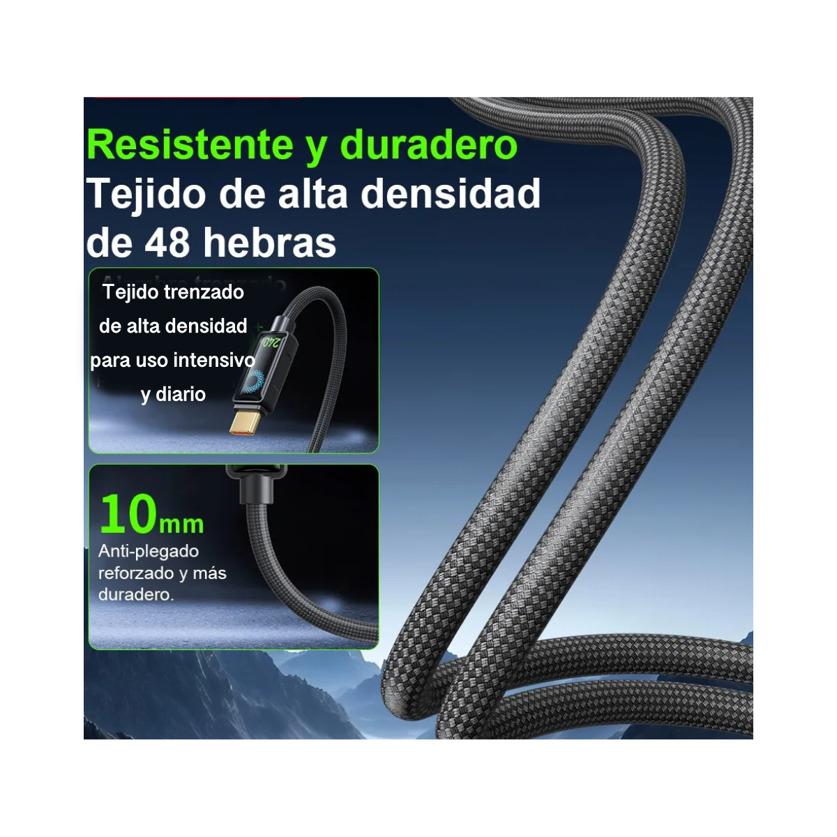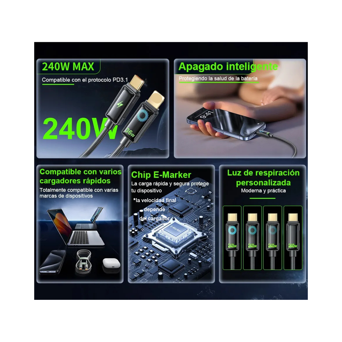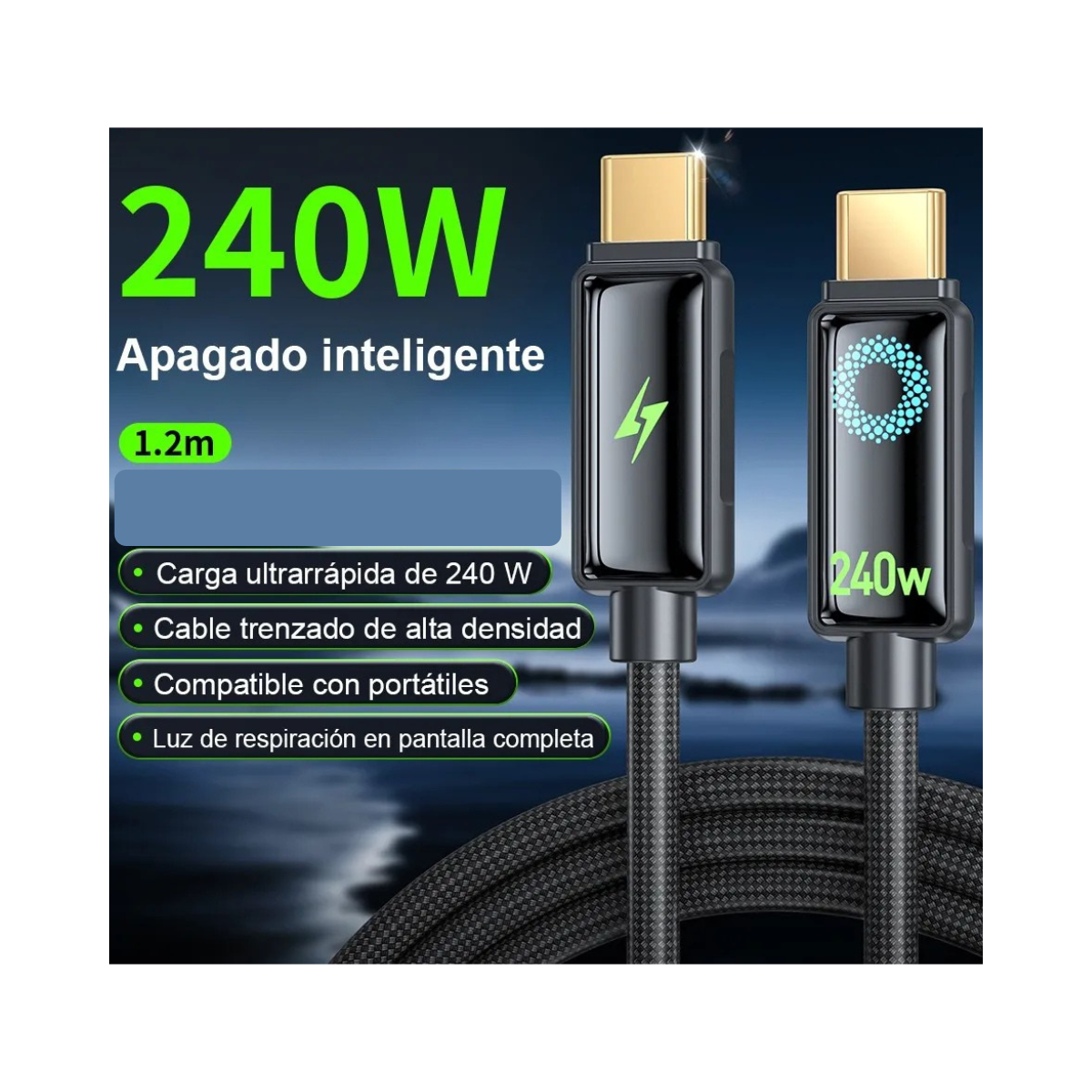 Cable USB-C a USB-C de carga rapida de 240W con corte automatico al completar la carga, revestimiento mallado trenzado y luz LED de respiracion animada.
