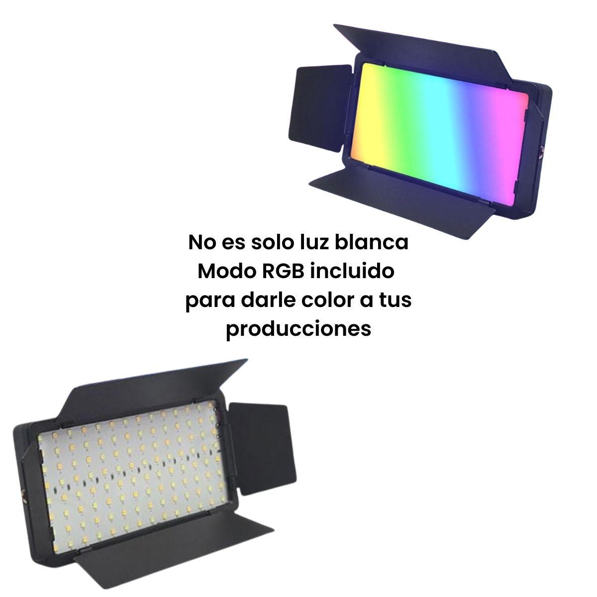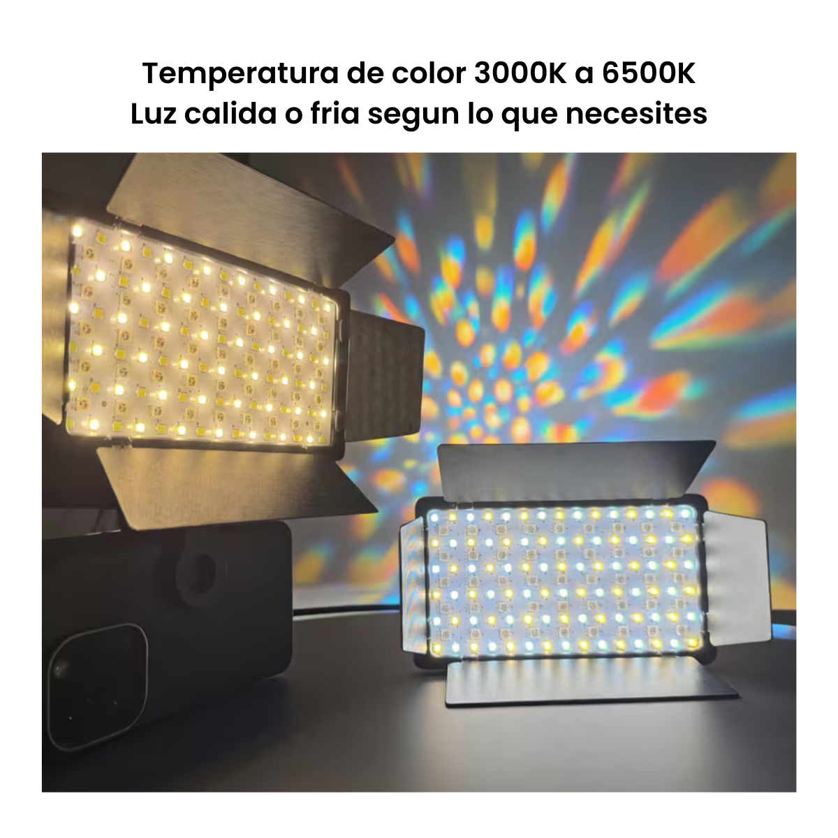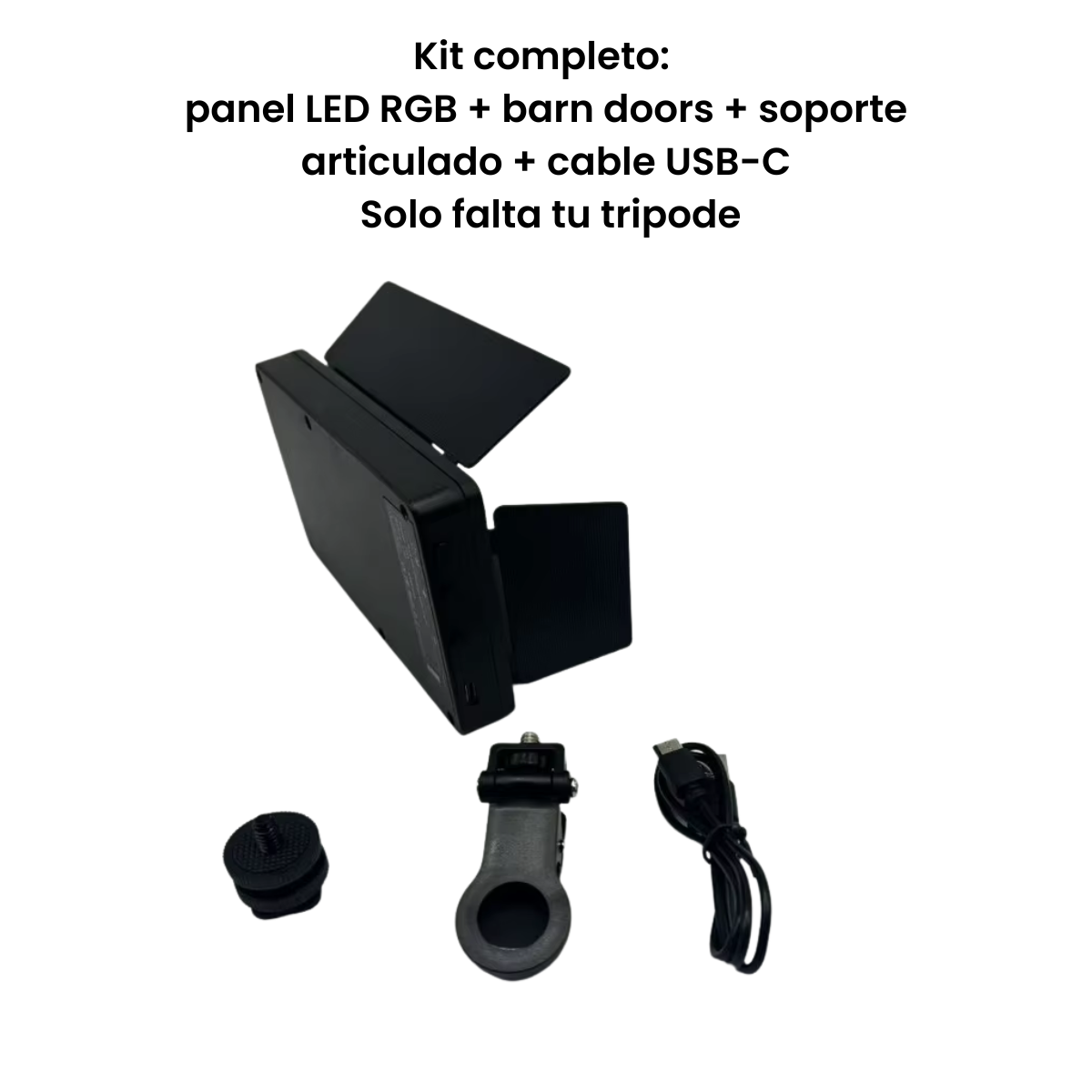 Panel LED portátil profesional con modo RGB y temperatura de color ajustable. La herramienta ideal para creadores de contenido, streamers y fotógrafos que quieren ir más allá de la luz blanca y sumar color a sus producciones. MODOS DE LUZ Modo bicolor: temperatura de color de 3000K a 6500K para pasar de una luz cálida y acogedora a una fría y nítida según la escena. Modo RGB: paleta de colores completa para ambientar, crear efectos de color y darle personalidad a tus videos y fotos. Brillo regulable del 5% al 100% en todos los modos. QUE INCLUYE EL KIT Panel LED con viseras integradas Soporte articulado con zapata fría rosca de trípode estándar 1/4'' Cable USB-C El producto NO incluye trípode ni cargador de pared. CONSEJOS PARA SACARLE EL MAXIMO PROVECHO Cuanto dura la batería: la autonomía de aproximadamente 3 horas corresponde a uso a intensidad media. A máximo brillo o con el modo RGB la duración puede ser menor: 90 minutos (1.5h) de uso continuo a máxima potencia. A qué distancia usarlo: para mejores resultados colocalo entre 30 y 80 cm del sujeto. Es un panel portátil y complementario, no reemplaza una luz de estudio fija. Cómo cargarlo correctamente: usá un cargador de 5V/1A mínimo y un cable USB-C apto para carga. Con cables solo de datos puede no cargar. Cómo montarlo: el soporte incluido es compatible con zapata de cámara y rosca de trípode estándar 1/4''. Para usarlo de forma independiente necesitás un trípode o soporte externo, no incluido. Cómo cambiar entre modos: el botón principal alterna entre modo bicolor y modo RGB. Consultá el instructivo incluido para conocer la secuencia de encendido y cambio de color. Los colores se ven igual que en la foto: los resultados pueden variar según la cámara, el entorno y la configuración de balance de blancos que uses. El modo RGB emite colores intensos que pueden verse distintos según la superficie que iluminés. PARA QUIEN ES ESTE PANEL Ideal para streamers que quieren ambientar su setup, creadores de reels y TikToks con luces de color, fotógrafos de producto que necesitan efectos creativos, y cualquier persona que busque una luz portátil y versátil para grabar con estilo.