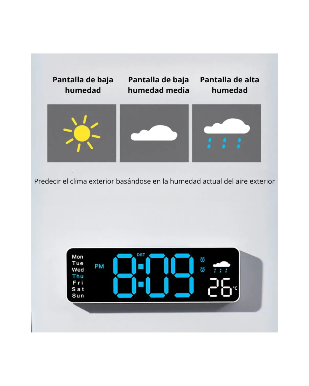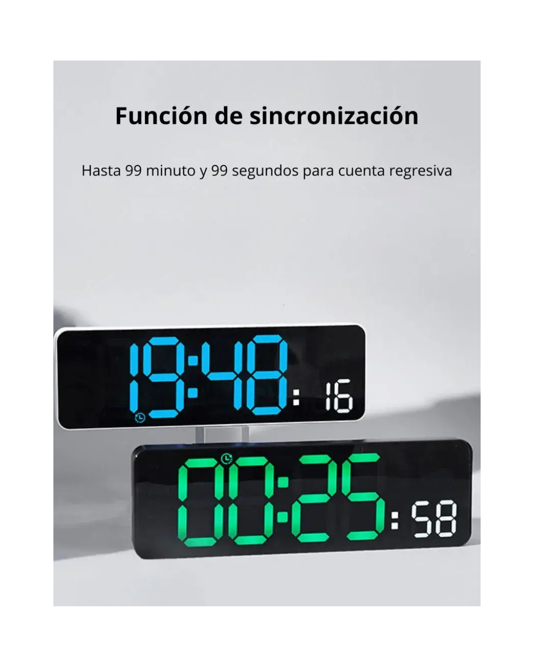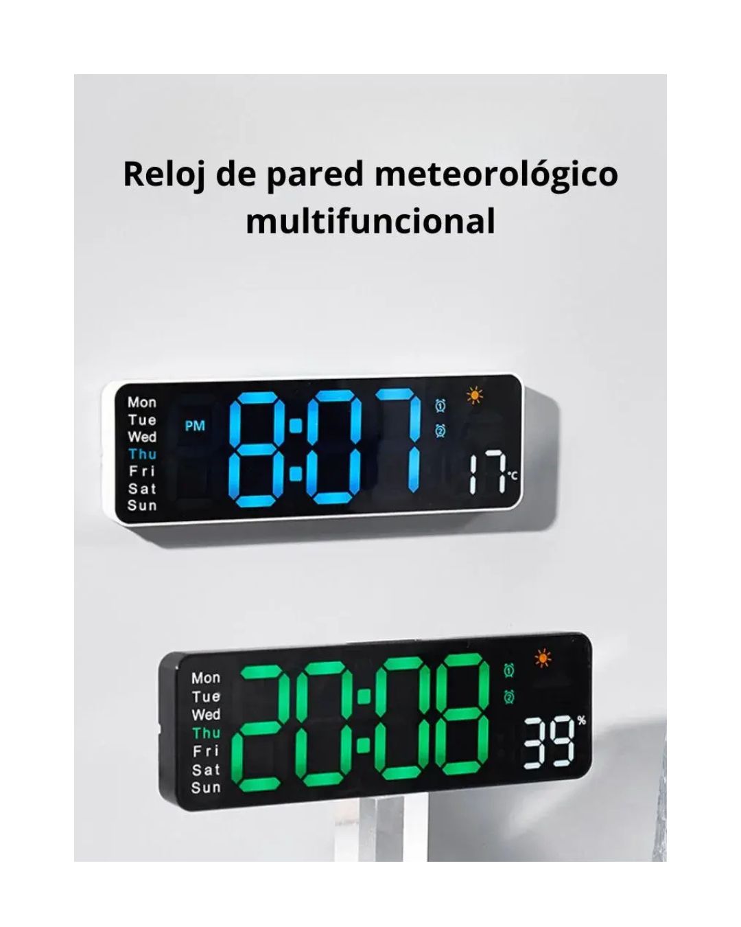 El Reloj de Pared Digital LED combina diseño moderno y funcionalidad avanzada para mantenerte siempre informado del tiempo y las condiciones del ambiente. Ideal para el hogar, oficina, comercio o espacios donde la precisión y la visibilidad sean importantes. Este reloj digital muestra hora, fecha, día de la semana, temperatura y humedad, ofreciendo una visión completa del clima interior. Su pantalla LED de gran tamaño garantiza una lectura clara a cualquier distancia, con brillo ajustable en 10 niveles o modo automático fotosensible que adapta la intensidad según la luz del ambiente. Cuenta con formato de hora 12/24 h, visualización de temperatura en °C o °F y dos alarmas configurables (diaria, fin de semana o por día específico). Además, incluye función de temporizador hasta 99 minutos y control remoto para un manejo cómodo sin necesidad de acercarte al dispositivo. Funciona conectado por cable USB (incluido) y dispone de memoria auxiliar mediante 2 pilas AAA que conservan la configuración ante cortes de energía. Su estructura incluye orificio trasero para colgar fácilmente en la pared. Con su combinación de estilo, practicidad y tecnología, el Reloj Digital LED es una solución completa para quienes buscan controlar el tiempo y el ambiente con precisión. Características principales: Pantalla LED grande y clara Muestra hora, fecha, semana, temperatura y humedad 10 niveles de brillo + modo automático fotosensible Formato de hora 12/24 h Visualización de temperatura °C / °F Dos alarmas programables Función de temporizador hasta 99:59 Control remoto incluido Funciona con alimentación USB 5V (cable incluido) Memoria con pilas AAA (No incluidas) Medidas: 27.8 x 2.5 x 9 cm Ideal para pared o escritorio Motivos para elegirlo: Alta visibilidad en todo momento Control total sin moverte de tu lugar Precisión en temperatura y humedad Diseño elegante y moderno Perfecto para hogares, oficinas o negocios Aprovechá esta oportunidad y modernizá tus espacios con un reloj digital completo, confiable y de diseño elegante.