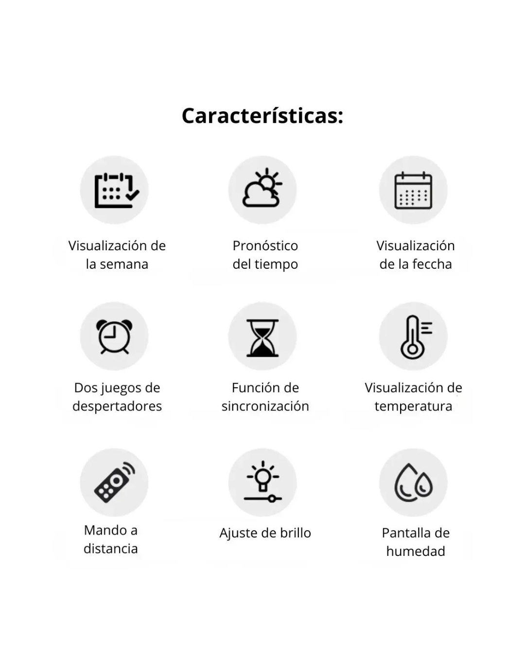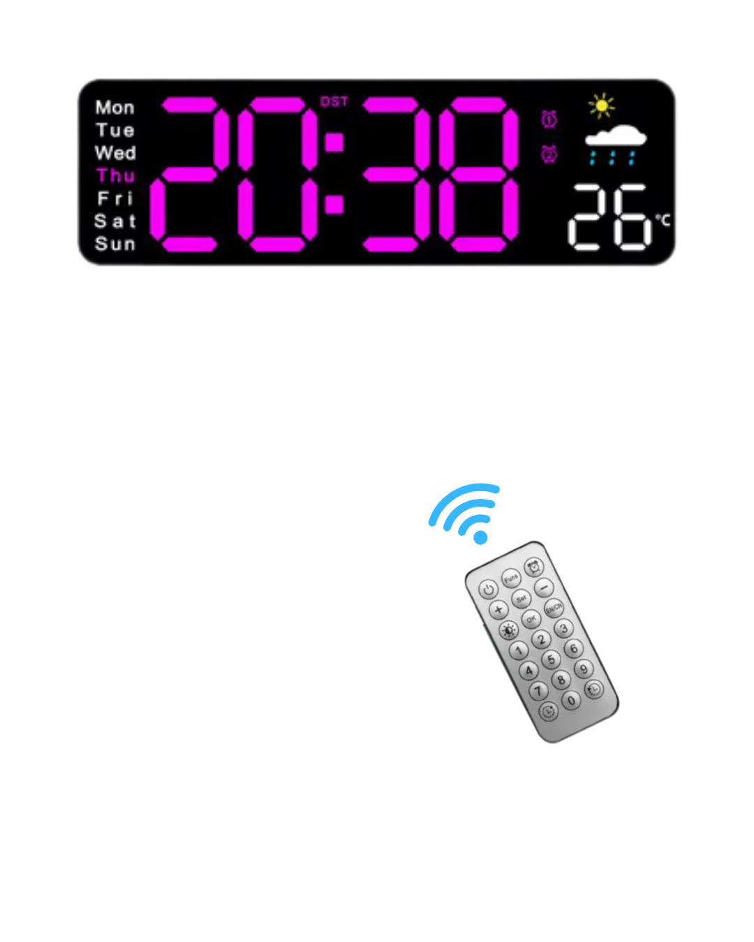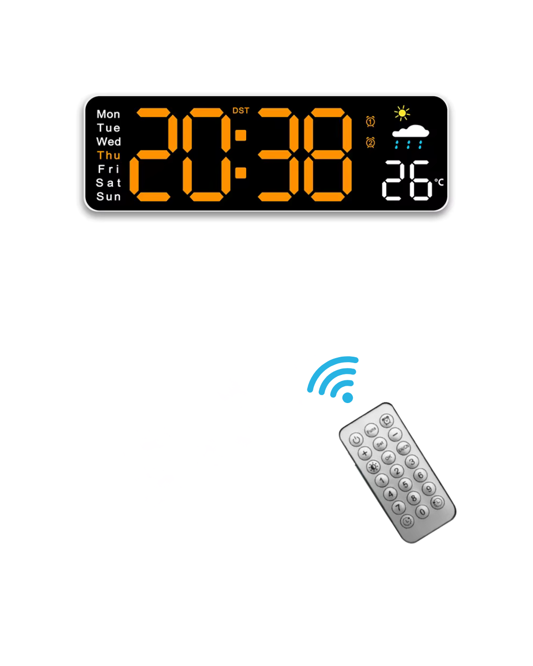 El Reloj de Pared Digital LED combina diseño moderno y funcionalidad avanzada para mantenerte siempre informado del tiempo y las condiciones del ambiente. Ideal para el hogar, oficina, comercio o espacios donde la precisión y la visibilidad sean importantes. Este reloj digital muestra hora, fecha, día de la semana, temperatura y humedad, ofreciendo una visión completa del clima interior. Su pantalla LED de gran tamaño garantiza una lectura clara a cualquier distancia, con brillo ajustable en 10 niveles o modo automático fotosensible que adapta la intensidad según la luz del ambiente. Cuenta con formato de hora 12/24 h, visualización de temperatura en °C o °F y dos alarmas configurables (diaria, fin de semana o por día específico). Además, incluye función de temporizador hasta 99 minutos y control remoto para un manejo cómodo sin necesidad de acercarte al dispositivo. Funciona conectado por cable USB (incluido) y dispone de memoria auxiliar mediante 2 pilas AAA que conservan la configuración ante cortes de energía. Su estructura incluye orificio trasero para colgar fácilmente en la pared. Con su combinación de estilo, practicidad y tecnología, el Reloj Digital LED es una solución completa para quienes buscan controlar el tiempo y el ambiente con precisión. Características principales: Pantalla LED grande y clara Muestra hora, fecha, semana, temperatura y humedad 10 niveles de brillo + modo automático fotosensible Formato de hora 12/24 h Visualización de temperatura °C / °F Dos alarmas programables Función de temporizador hasta 99:59 Control remoto incluido Funciona con alimentación USB 5V (cable incluido) Memoria con pilas AAA (No incluidas) Medidas: 27.8 x 2.5 x 9 cm Ideal para pared o escritorio Motivos para elegirlo: Alta visibilidad en todo momento Control total sin moverte de tu lugar Precisión en temperatura y humedad Diseño elegante y moderno Perfecto para hogares, oficinas o negocios Aprovechá esta oportunidad y modernizá tus espacios con un reloj digital completo, confiable y de diseño elegante.