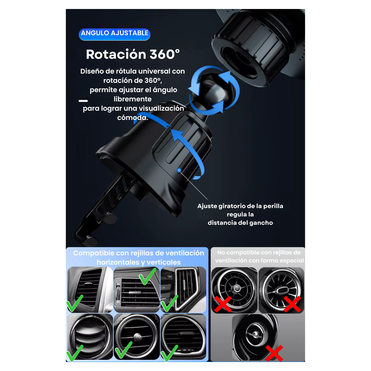 2 modos de instalación: rejilla de ventilación o superficie adhesiva (tablero, consola)