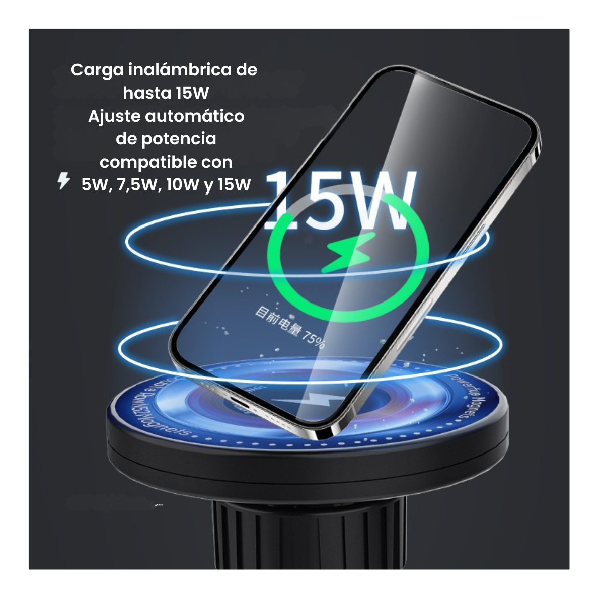 Compatible con iPhone 12 en adelante (MagSafe nativo) y Android con funda magnética