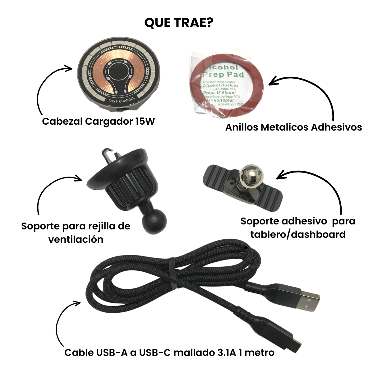 el kit no incluye adaptador de encendedor (cargador de auto). Para carga inalámbrica efectiva el adaptador debe entregar al menos 10W-15W. Los de baja potencia pueden sostener el celular pero no cargarlo a velocidad completa.
