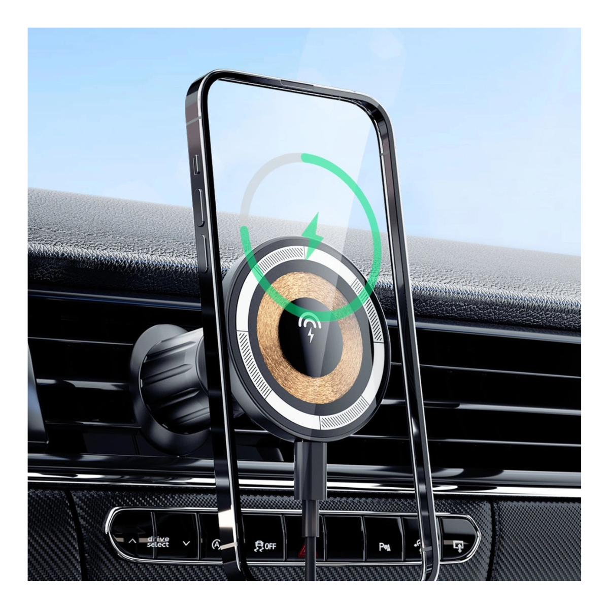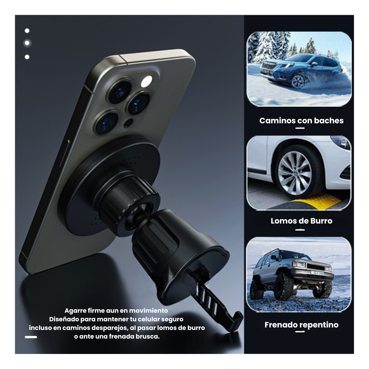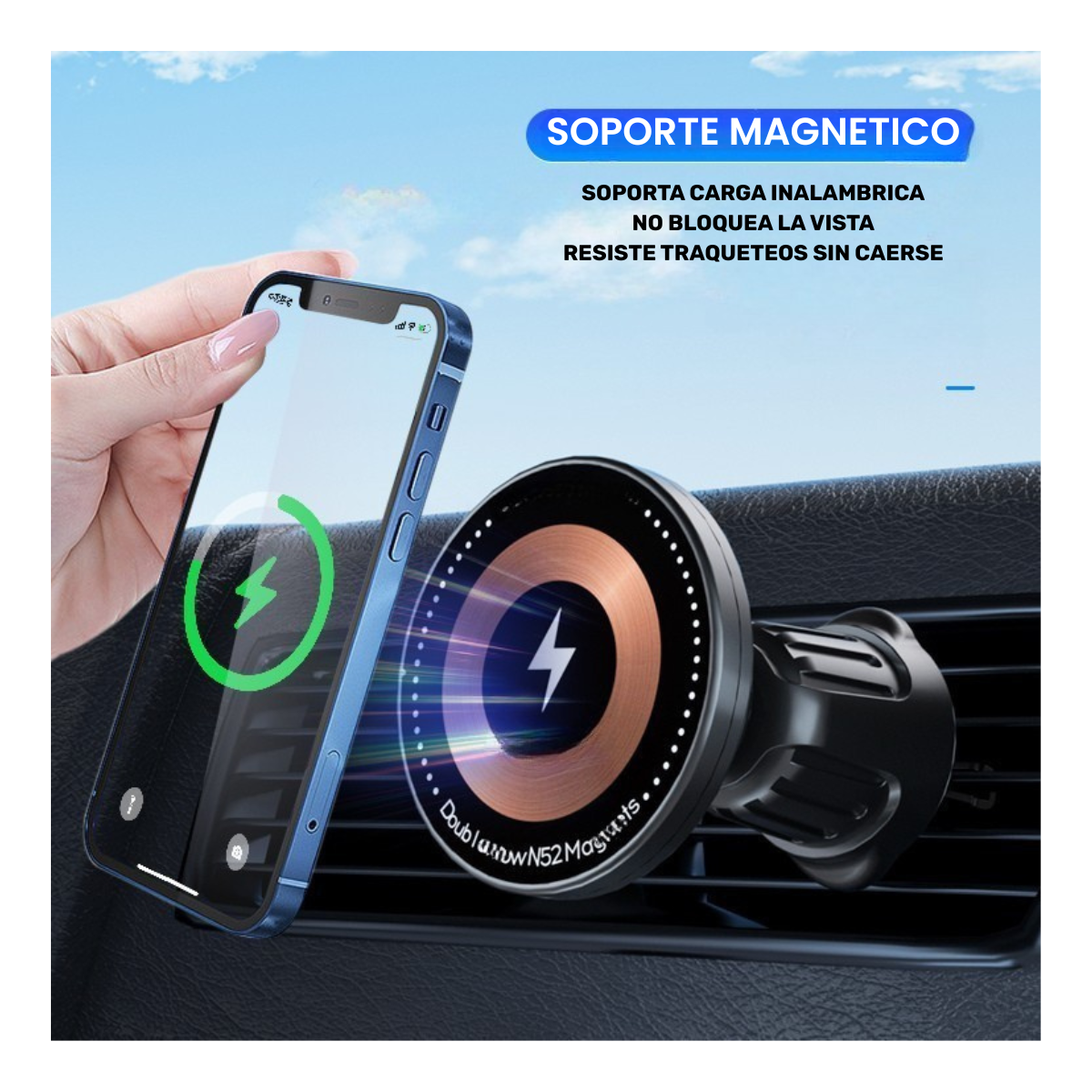 Todo lo que necesitás para tener el celular fijo, visible y cargándose mientras manejás, sin cables al teléfono y sin perder un segundo.