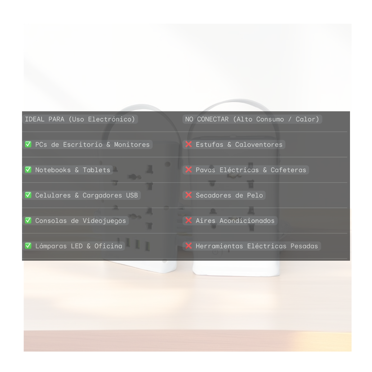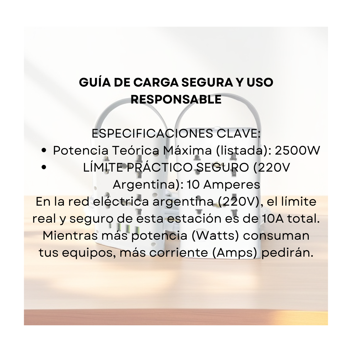 ATENCIÓN: El límite de carga es de 10 Amperes. Evitá conectar electrodomésticos de calor de alto consumo (estufas, pavas eléctricas) para prolongar la vida útil del producto. Ideal para setup de PC, oficina o mesa de luz.