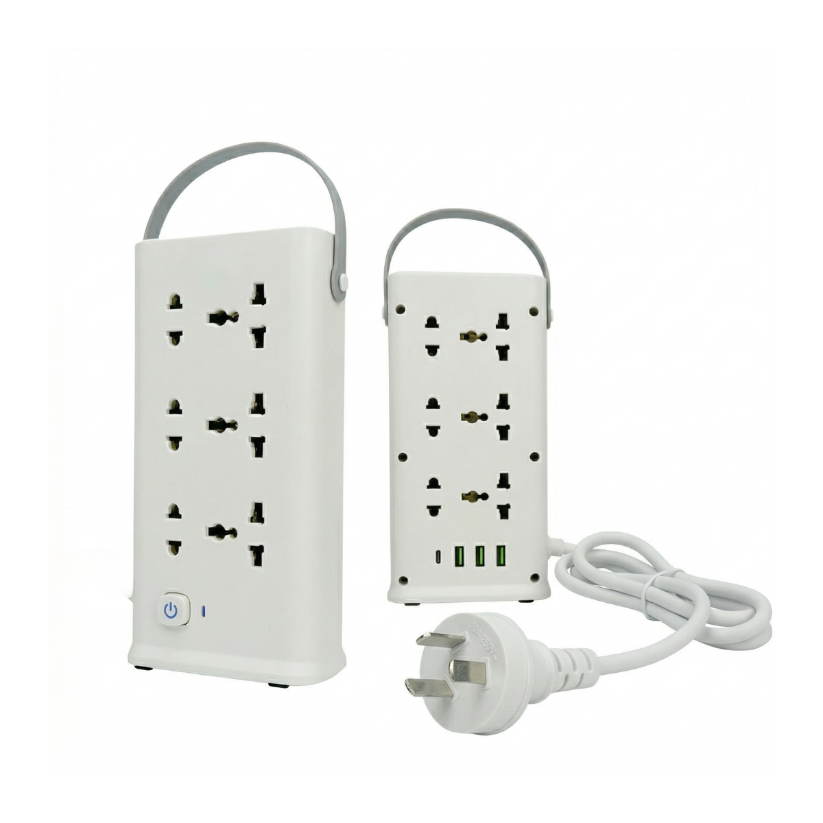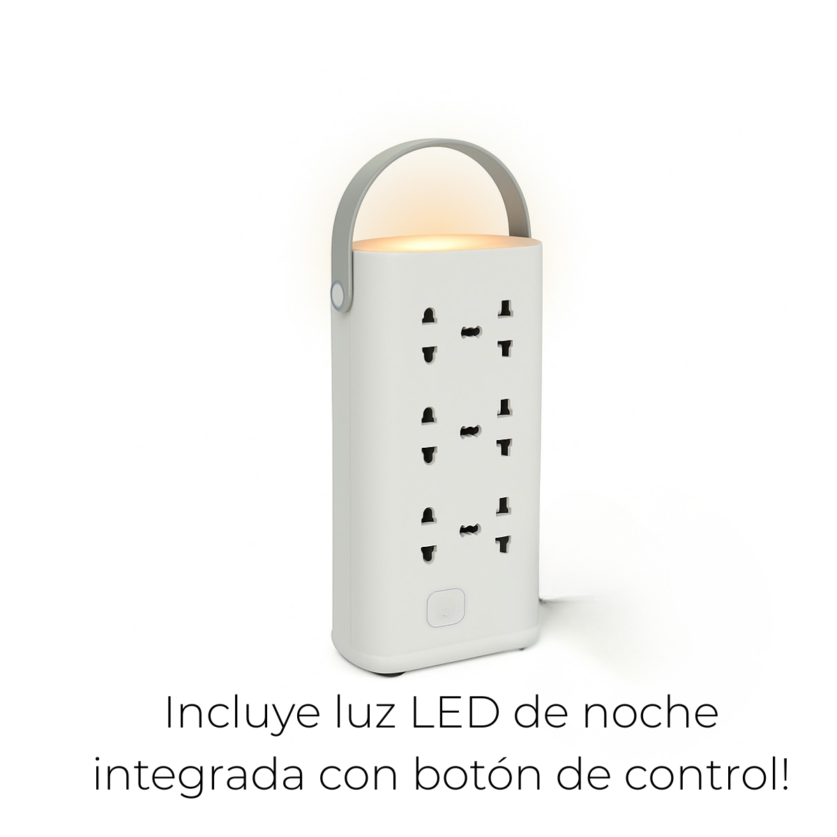 Torre multitoma vertical de alto rendimiento con 12 tomas y 4 puertos de carga USB (incluyendo Tipo-C). Diseñada para organizar tu escritorio o mesa de luz, eliminando el desorden de cables con un diseño compacto y seguro. Incluye una práctica luz de noche en la parte superior.