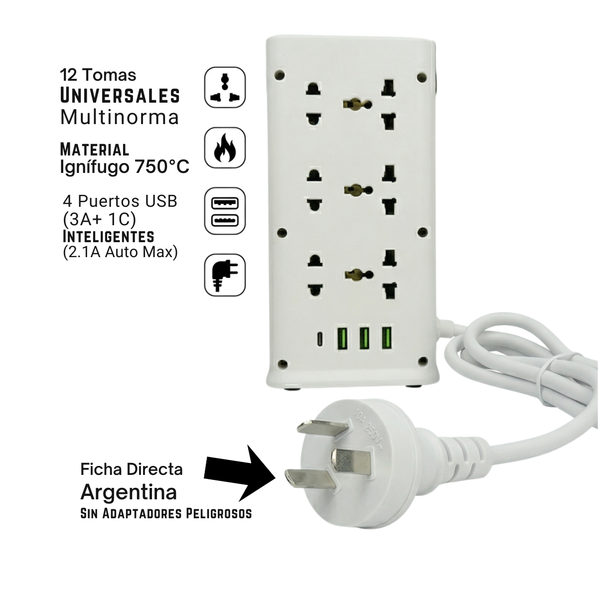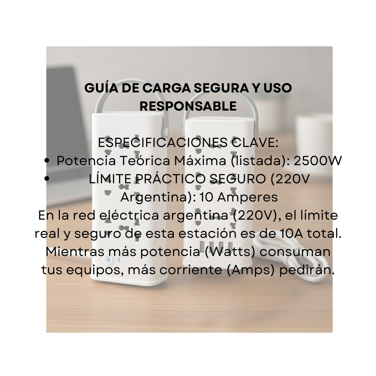 ATENCIÓN: La potencia máxima es de 2500W (10A). Verificá el calce firme de tus fichas universales antes de usar para garantizar un contacto seguro.