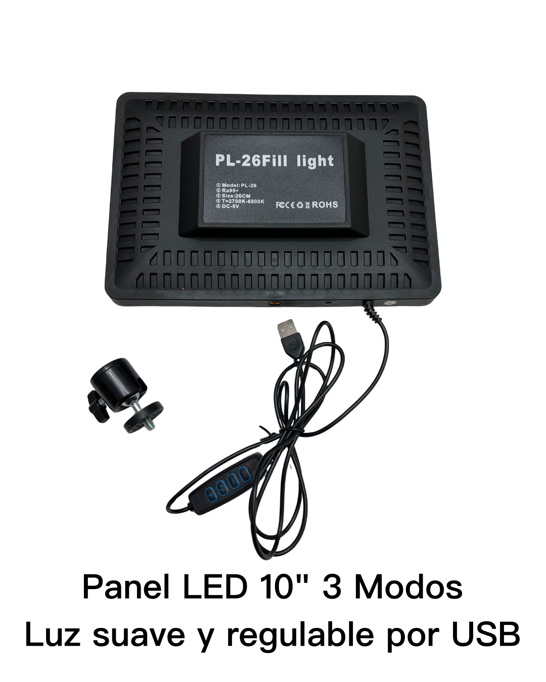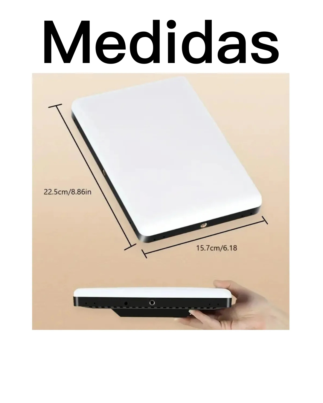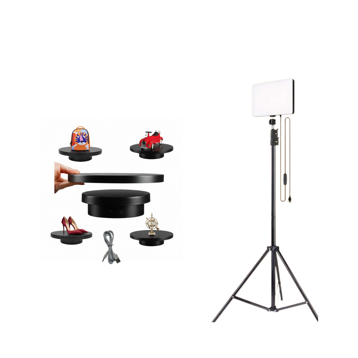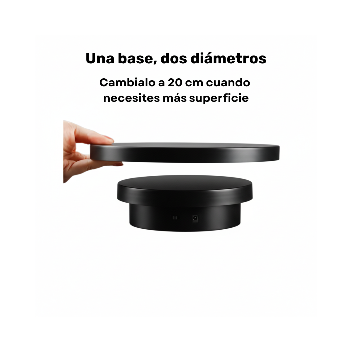 Solución dos en uno para estudio y vitrinas: base giratoria 360 grados con diámetros intercambiables y panel LED de 10 pulgadas con trípode de 2,10 m. Ideal para joyería, calzado, cosmética, coleccionables y contenido para redes.