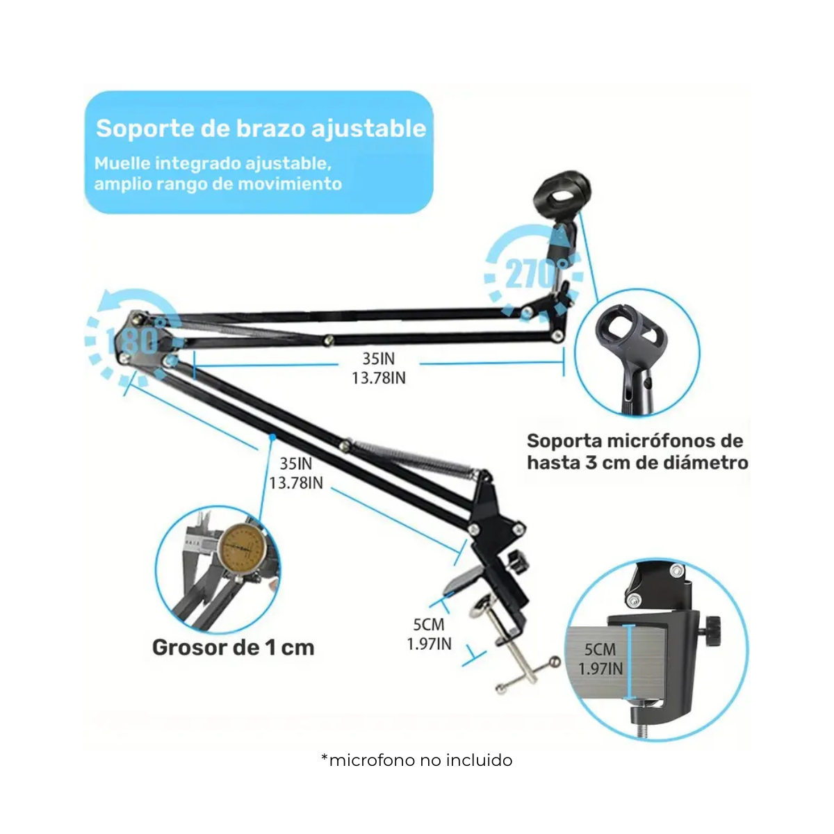 NO es compatible directamente con micrófonos condensadores grandes (como Blue Yeti, HyperX Quadcast, etc.). Para esos modelos, necesitarás usar la montura "araña" o el adaptador de rosca que vino con tu micrófono condensador (no incluidos con el brazo). La morsa requiere un borde de escritorio plano para sujetar firme.