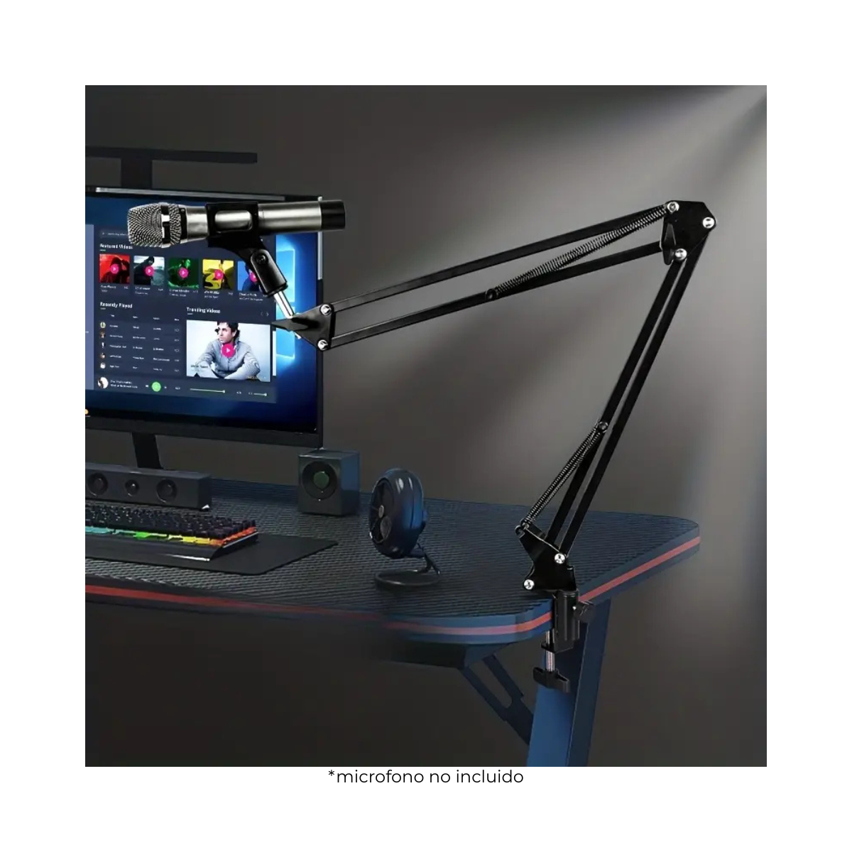 Soporte de micrófono de escritorio con brazo articulado y abrazadera en F. Estructura metálica estable y plegable, ideal para streaming, podcast, clases online y reuniones. Soporta hasta 1,5 kg y el clip incluido es compatible con micrófonos de Ø 3,0 cm. Ajuste suave en altura y ángulo para lograr el punto de voz perfecto sin ocupar espacio en la mesa.