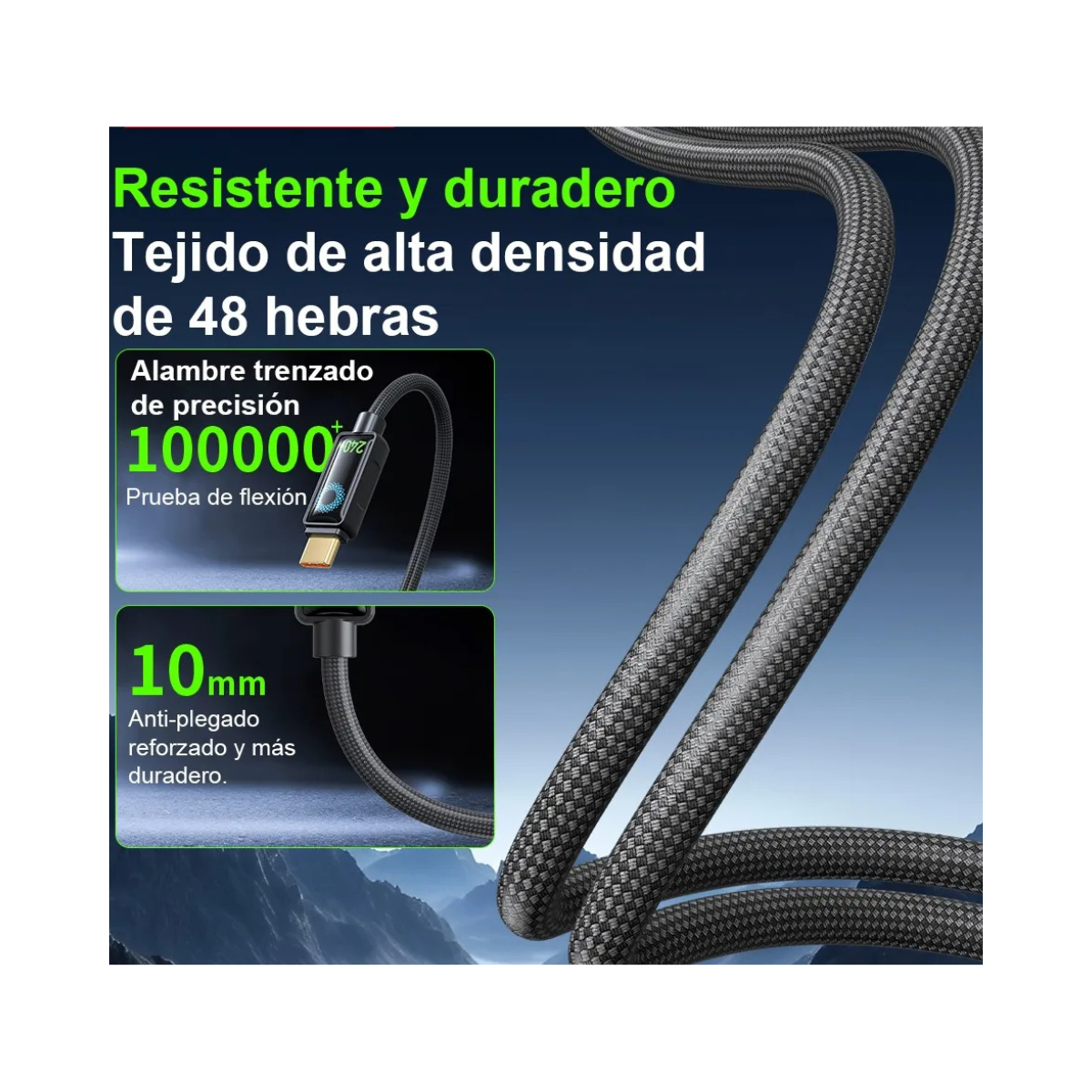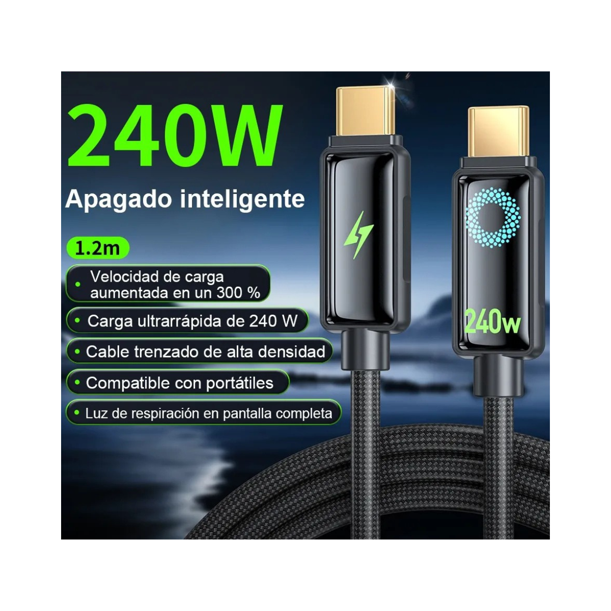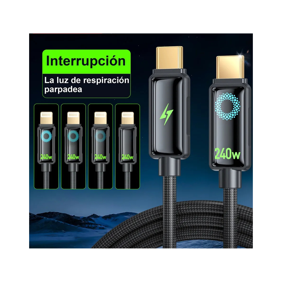 ATENCIÓN - LEER ANTES DE COMPRAR: Velocidad de Carga: Para alcanzar los 240W (o la carga máxima de tu equipo), es necesario usar un cargador (fuente) que soporte dicha potencia. El cable por sí solo no aumenta la velocidad del cargador. Display: Los valores en pantalla oscilan según el estado de la batería; es normal que bajen a medida que se acerca al 100%. Compatibilidad: La versión USB-C a USB-C es para iPhone 15 en adelante, Androids y Laptops.