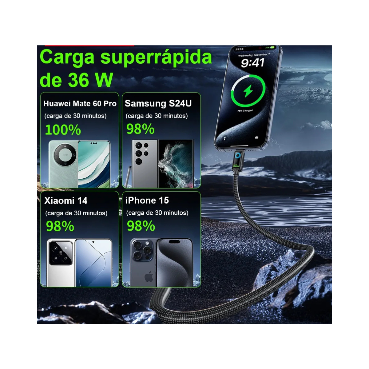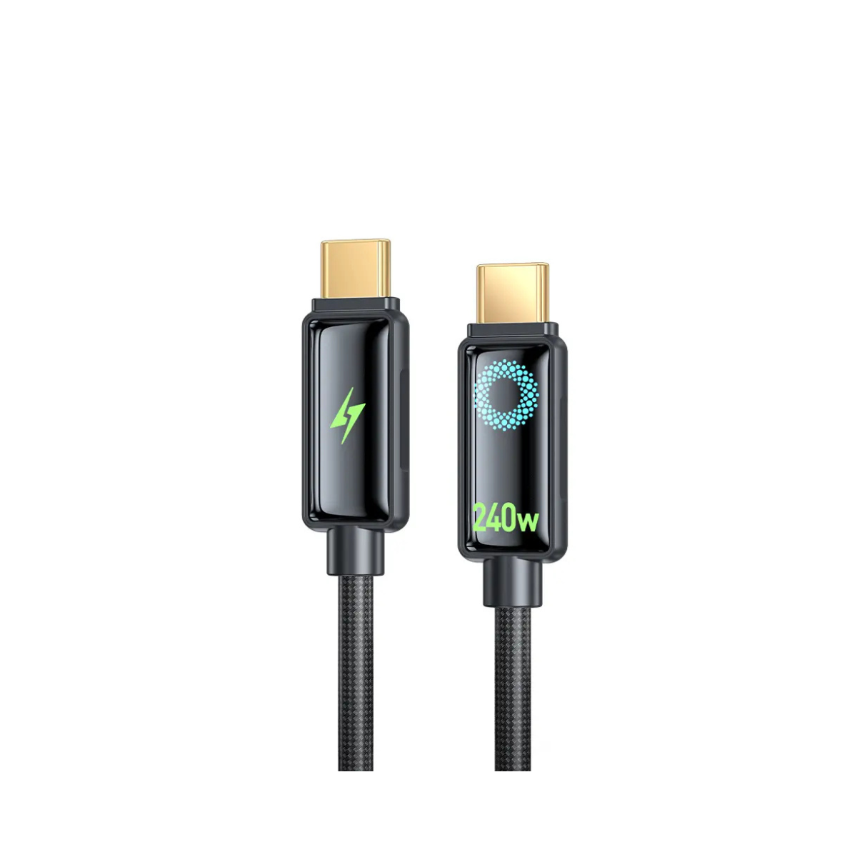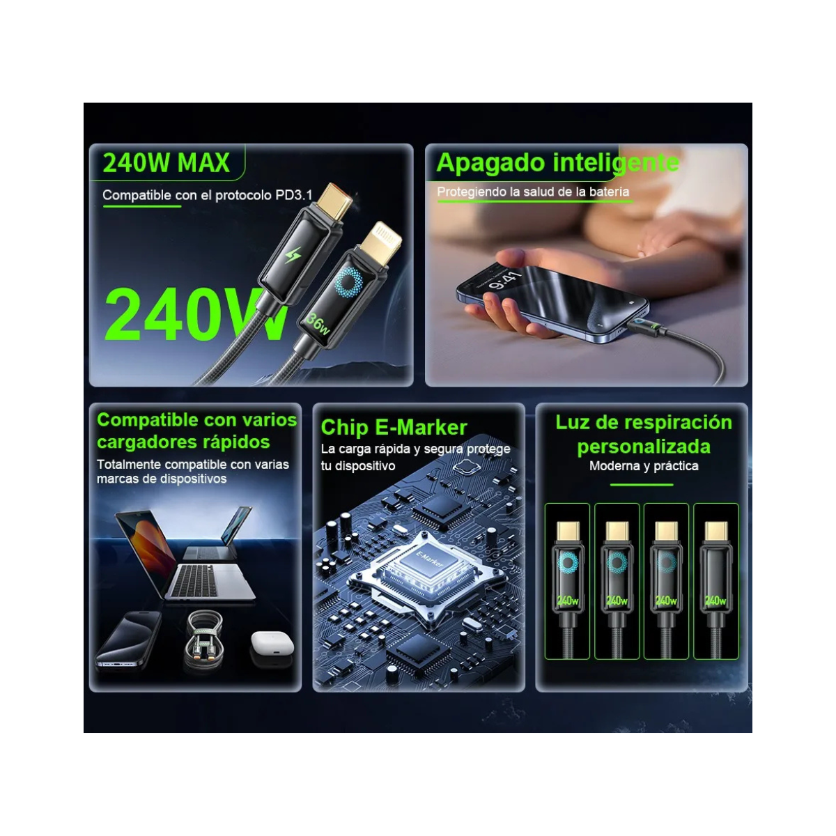 ATENCIÓN - LEER ANTES DE COMPRAR: Velocidad de Carga: Para alcanzar los 240W (o la carga máxima de tu equipo), es necesario usar un cargador (fuente) que soporte dicha potencia. El cable por sí solo no aumenta la velocidad del cargador. Display: Los valores en pantalla oscilan según el estado de la batería; es normal que bajen a medida que se acerca al 100%. Compatibilidad: La versión USB-C a USB-C es para iPhone 15 en adelante, Androids y Laptops.