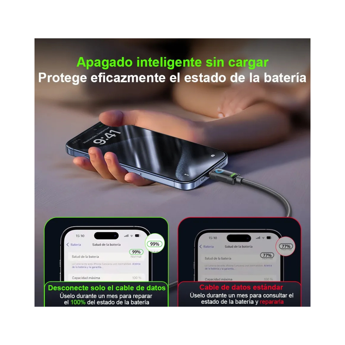 Este cable no solo carga tu dispositivo a la máxima velocidad posible, sino que te permite ver en tiempo real la potencia de carga gracias a su pantalla LED integrada. Equipado con tecnología de apagado inteligente, protege la vida útil de tu batería deteniendo la corriente cuando la carga está completa.